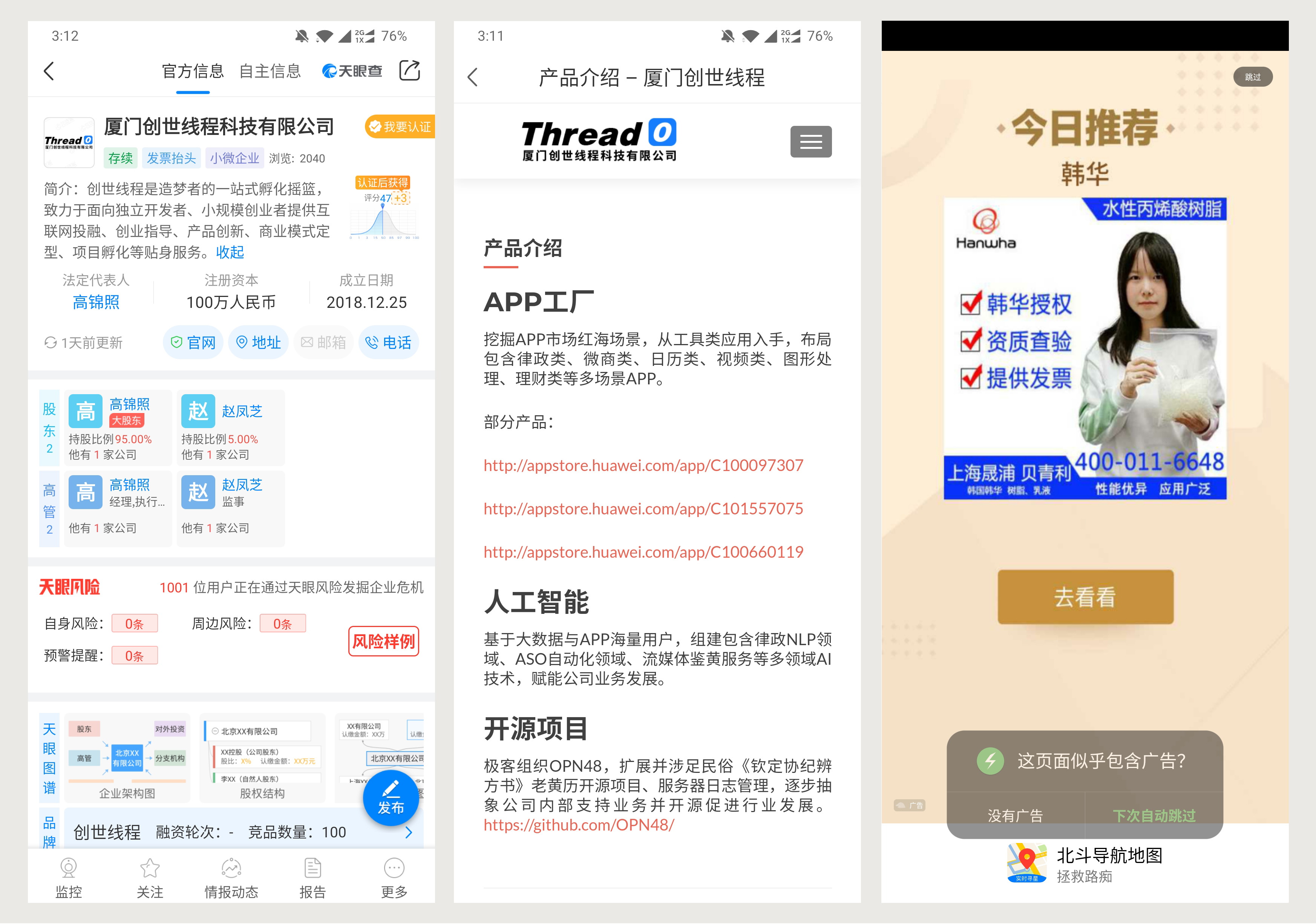 所以现在已经证明“北斗导航地图”是一款彻彻底底的“李鬼”App,完全是套壳的百度/高德地图,在任何手机上都可以使用,那么这些“李鬼”App 出现的目的何在?通过天眼查搜索开发者“厦门创世线程科技有限公司”发现,这是一家小微企业,业务和产品以 H5 游戏、日历、微商等工具类 App 为主,这些 App 都有着共同的特征——通过植入广告盈利,我在使用“北斗导航地图”的过程中,也发现开屏页和界面上充斥着各种不靠谱的小广告,而除此以外,还有一些类似的“李鬼”App 甚至敢明目张胆的收费使用。