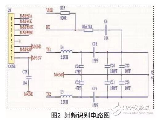 射频识别部分电路如图2所示,磁卡进入天线产生的磁场后,接收解读器发出的射频信号,凭借感应电流所获得的能量通过TX1和 TX2发送出存储在芯片中的产品信息,解读器RC522读取信息并解码后,通过M-MFMOSI、M-MFMISO和M-MFRST送至STC 11F32进行 有关的数据处理。