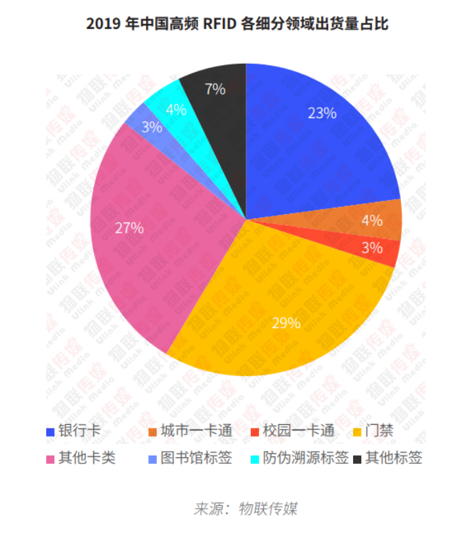 高频RFID的细分领域从大类上来说,可以分为卡类应用与标签类应用。其中卡类应用可以分为银行卡、城市一卡通、校园一卡通、门禁卡,除此之外,其他卡类种类繁多,加起来也是一个非常可观的数字。
