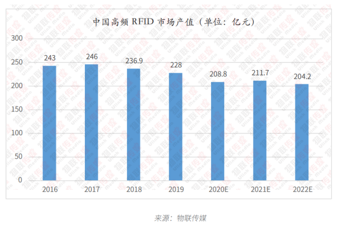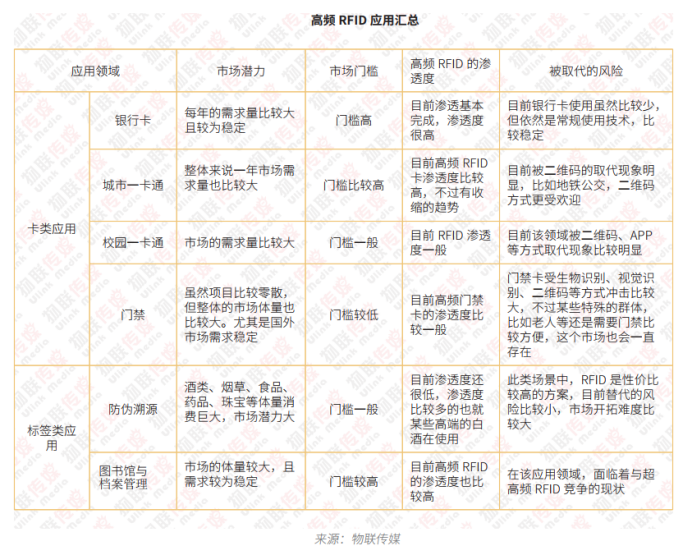 可以将这个市场理解为一个存量市场,虽然在其他技术的冲击之下,没有什么增长点,但经过这些年新旧技术方案的市场磨合,目前还是有很多场景依然在采用RFID技术方案。而其中值得注意的是,随着高频RFID方案成本的降低,在卡类应用中,之前很多采用低频RFID的市场,也在被高频RFID所取代。
