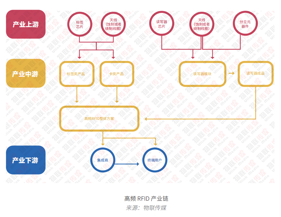 高频RFID的中游主要涵盖高频标签与高频卡类供应商、读写器产品(固定式、手持式)供应商以及整体解决方案供应商。