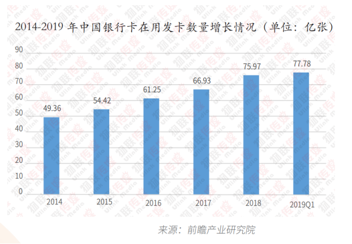 根据前瞻产业研究院的数据,截至2018年末,全国银行卡在用发卡数量75.97亿张,同比增长13.51%。截至2019年一季度,全国银行卡在用发卡数量77.78亿张,环比增长2.32%。其中,借记卡在用发卡数量70.83亿张,环比增长2.48%;信用卡和借贷合一卡在用发卡数量共计6.90亿张,环比增长0.63%。全国人均持有银行卡5.57张,其中,人均持有信用卡和借贷合一卡0.49张。