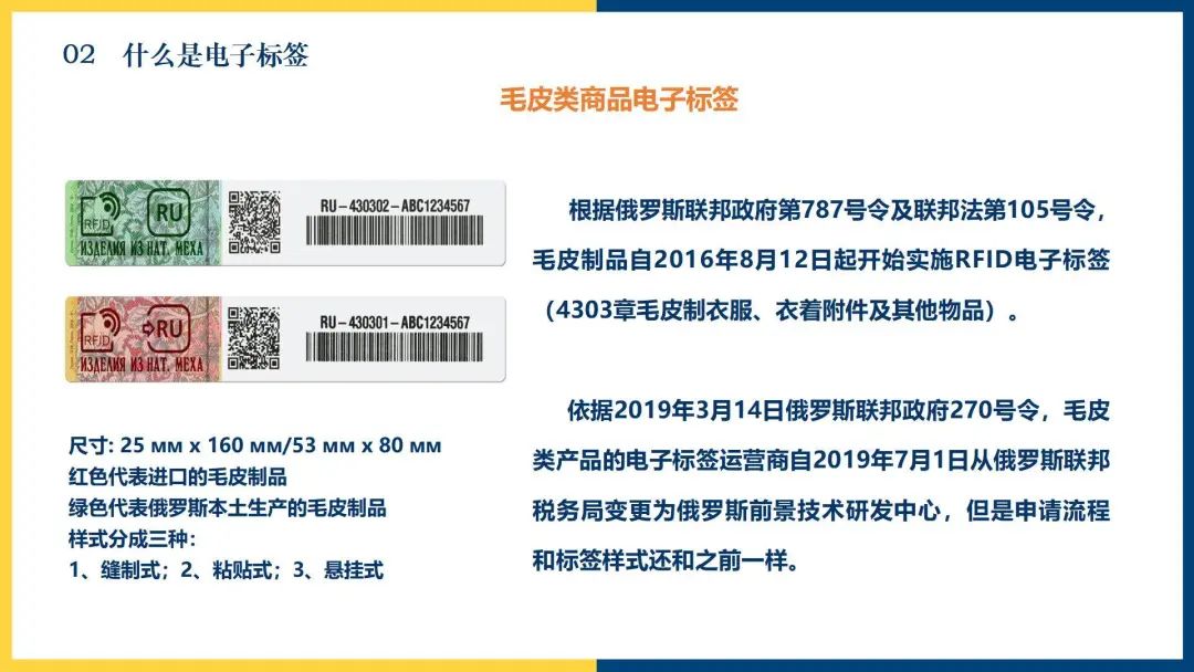 根据俄罗斯联邦政府第787号令及联邦法第105号令,毛皮制品自2016年8月12日起开始实施RFID电子标签(4303章毛皮制衣服、衣着附件及其他物品)。