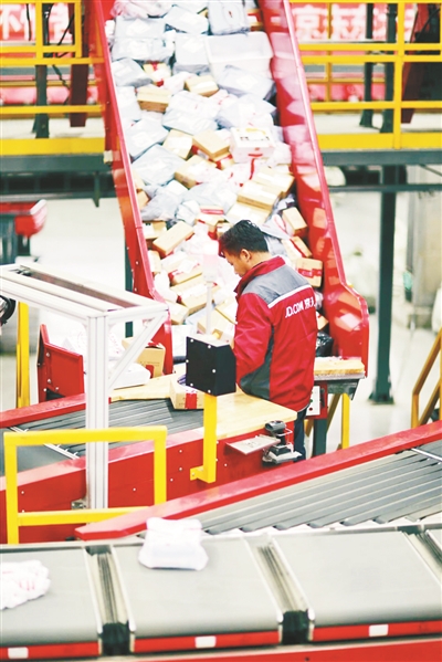 京东物流中心的工作人员在整理包裹。