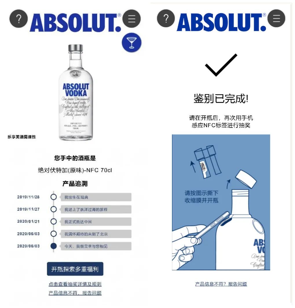 以上就是保乐力加NFC标签的使用攻略了,你学会了吗?由NFC技术加持的“乐鉴+”即是保乐力加产品流通追溯系统的一次巨大飞跃,其日趋完善的功能也在消费者权益保障方面起到了积极的作用,助力消费者可以安心购买产品。
