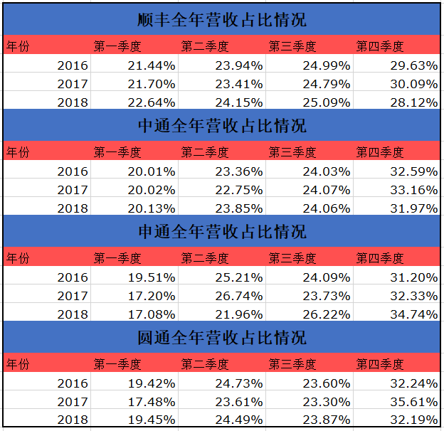 目前,双十一已经成为“全民剁手”的重大节日,不仅是对品牌、平台、支付的考验,更是对快递物流行业的考验。数据显示,2019年天猫双十一的订单总额达到了2684亿元。通过顺丰、圆通、申通、中通等快递物流公司的营收情况可以发现,它们一年中几乎均是第四季度的营收占比最高,这无疑与双十一的影响高度相关。