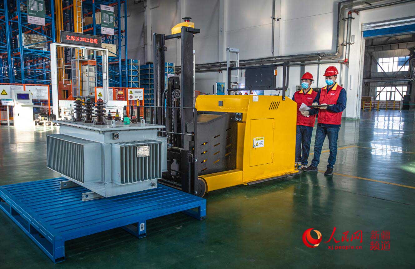 11月11日,国网乌鲁木齐供电公司物资供应中心工作人员在老满城智能仓储调试智能装卸设备。