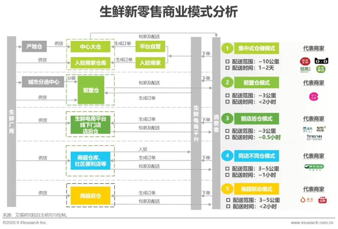 各新零售业态百花齐放,主要可分为以下几类商业模式,其中前店后仓冷链物流仓储模式配送效率最高,仓储成本较低,线上线下流量较其他模式更容易互通,但其配送范围受一定局限。