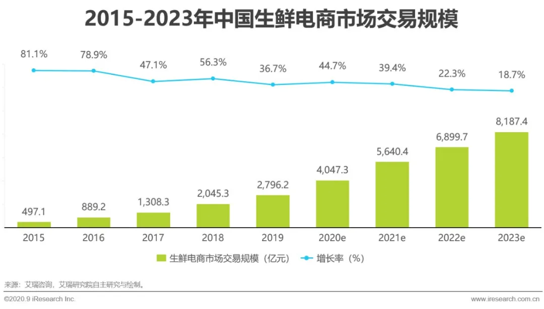 中国生鲜电商市场发展迅速,2019年生鲜电商市场交易规模达到2796亿元。阿里京东等电商巨头入局,不断加码供应链及物流等基础建设投资,并带来了线上线下融合的新零售模式,使得生鲜电商市场备受关注。未来随着生鲜电商模式的成熟、网购生鲜用户覆盖数量愈发广泛以及技术成熟、生鲜电商供应链的升级,生鲜电商行业仍将保持快速发展。