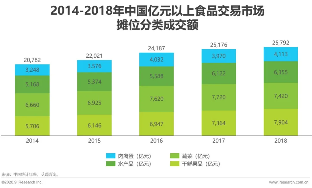 其中,干鲜果品交易额的增速最快,与居民生鲜食品消费情况相符,表现出居民的食品消费由生活必须的食物向更高品质、多样化的消费结构升级的趋势。