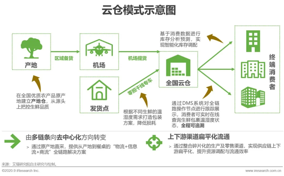 传统生鲜供应链企业大多是2B模式,服务于餐饮、超市、加工厂等,不具备2C端的服务能力。因此,生鲜新零售玩家必须依靠自身额外建立2C端服务资源。这种供应链两端的分立导致全链条上的资源与数据不能充分整合利用,因而效率始终无法得到有效提升。针对这一痛点,新型的云仓模式应运而生,新型供应链服务商通过整合全国范围内的产业链资源,形成生鲜供应链平台,从而实现了从产地至终端消费者的一站式生鲜供应链解决方案。