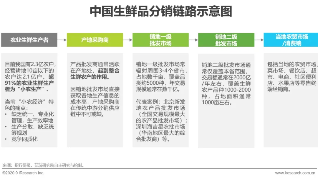 我国生鲜品类繁多,主要包括蔬果类、肉类、海鲜类等,具有鲜活易腐、不耐贮运、生产季节性强、消费弹性系数小等特点。传统分销供应链模式下,生产者与消费者相隔多层分销环节,限制了生鲜品流通速度,并造成大量耗损。