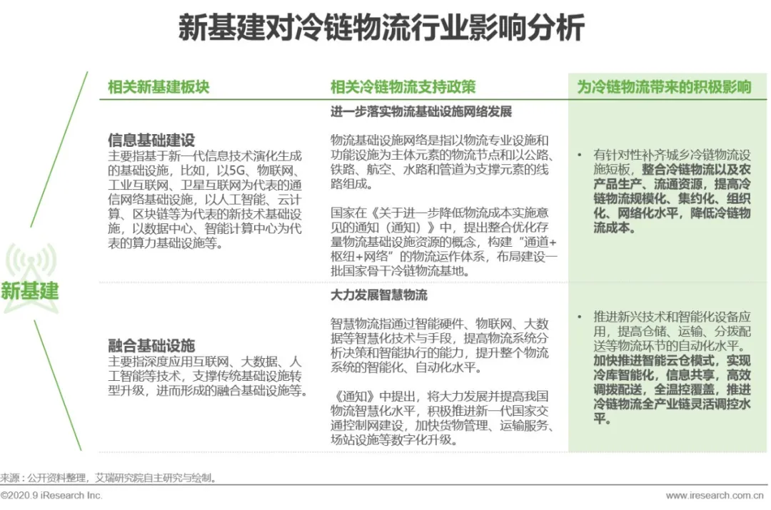 在新基建相关的宏观政策影响下,未来以5G、AI和工业物联网、互联网为代表的行业将会得到快速发展。随着大数据不断开拓升级赋能冷链物流,冷链物流领域的潜力也将会得到进一步的有效释放,持续朝着自动化、智能化云仓模式的方向发展。
