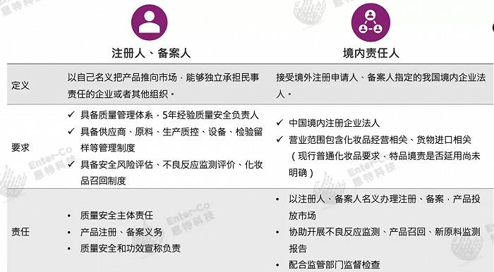 一方面,《化妆品监督管理条例》在原有基础上确立了化妆品注册人、备案人制度,规定获得了特殊化妆品注册证的注册人或通过化妆品备案的备案人,需要具备与申请注册、进行备案的产品相匹配的质量管理体系支持,要对产品全生命周期质量安全和功效宣称负责,在上市前负责注册备案管理,在上市后负责不良反应监测、评价及报告、产品风险控制及召回、产品及原料安全性再评估等相关义务,承担注册备案产品质量安全的主体责任。